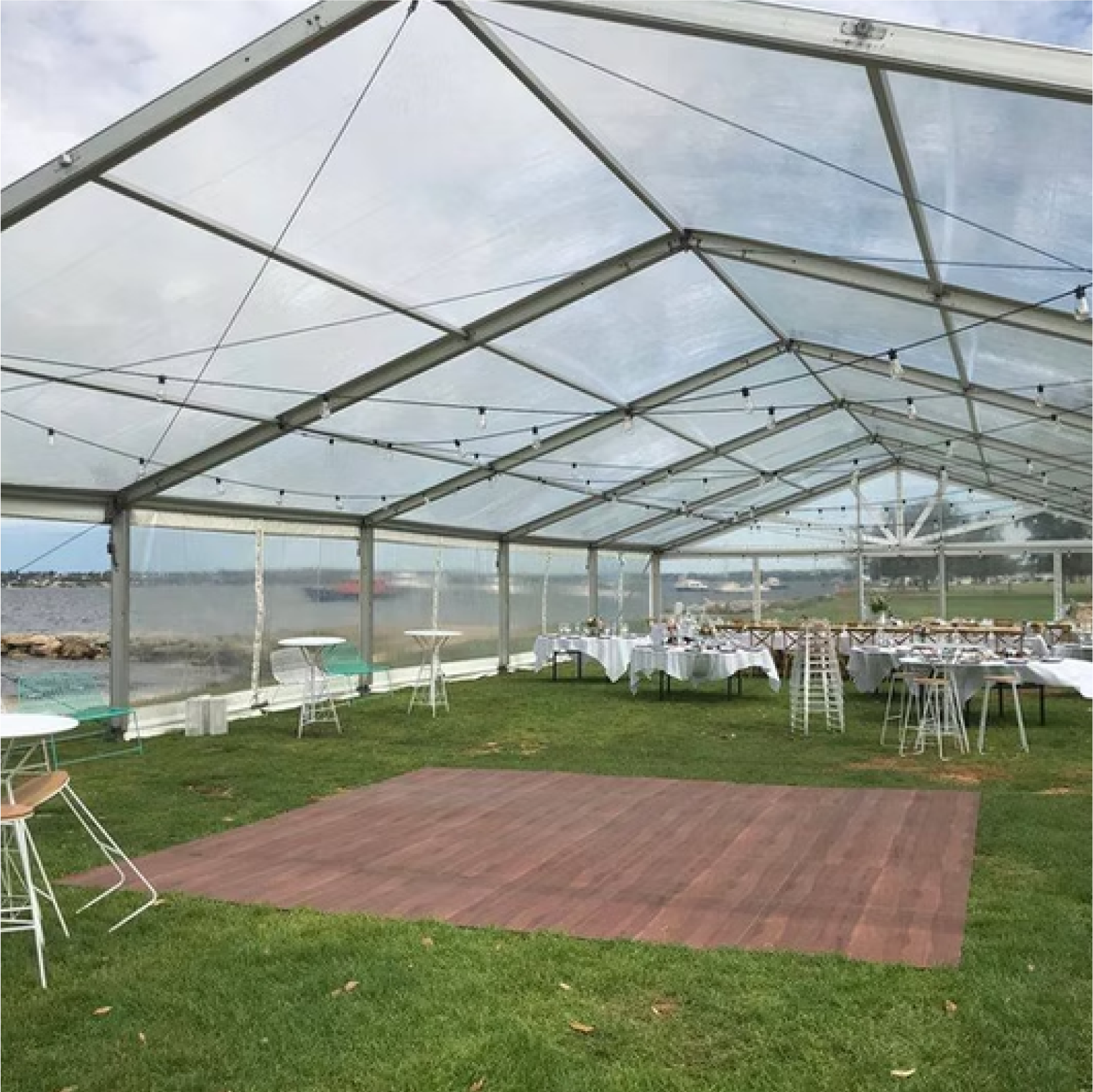 US-made snap-lock modular dance floor system with professional finish. Creates a stable, classic look surface for dancing at weddings, galas, and events. Available for self-installation or professional setup by Freo Hire. Each tile measures 93cm x 93cm and comes with edging for a polished finish. Maximum size 5.7m x 5.7m.